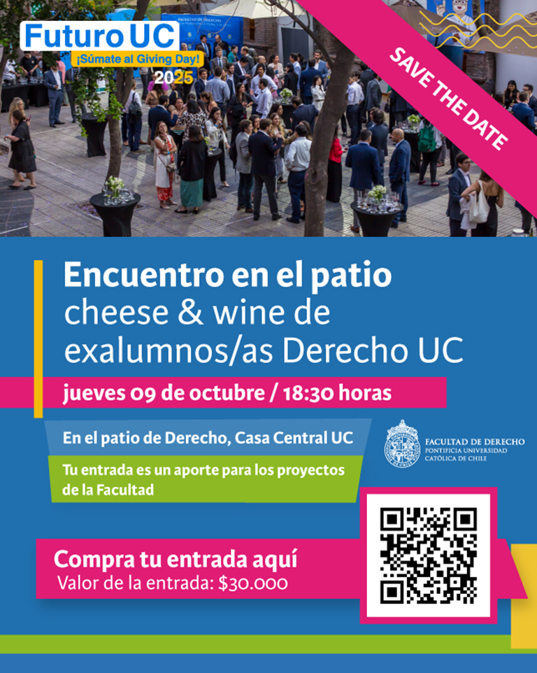 El próximo jueves 9 de octubre, te invitamos a participar del Encuentro en el patio cheese & wine de exalumnos y exalumnas de Derecho UC el jueves 9 de octubre a las 18:30 horas en la Facultad ubicada en nuestra Casa Central UC.