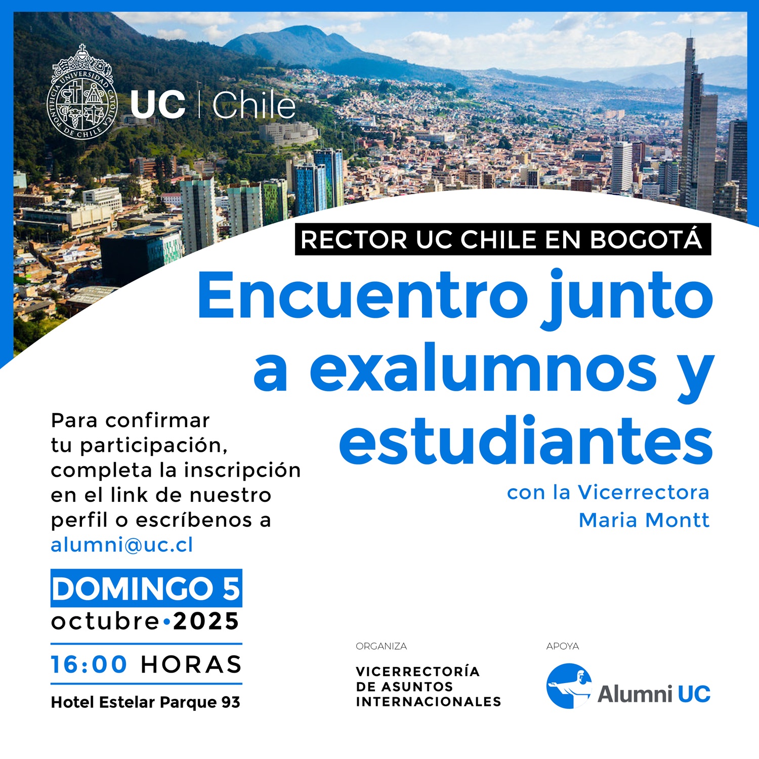 El domingo 5 de octubre en la ciudad de Bogotá se llevará a cabo un encuentro con el Rector Juan Carlos de la Llera junto a exalumnos y exalumnas, y a estudiantes de los magísteres online, donde además participarán las autoridades UC María Montt, Vicerrectora de Asuntos Internacionales; Álvaro Ossa, Director de Transferencia y Desarrollo; y Catalina Gerstmann, Jefa de Relacionamiento Institucional.